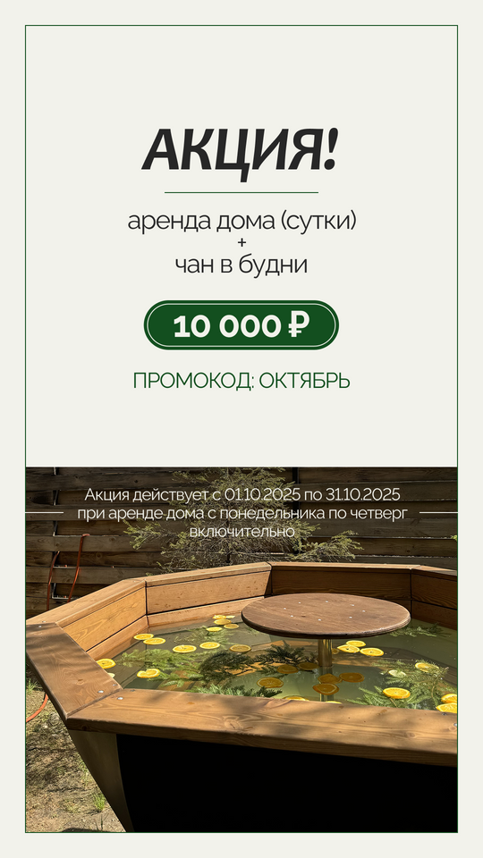 Погрузитесь в целительное тепло вашего персонального чана! Забронируйте уютную купель под открытым небом — идеальный способ восстановить силы после активного дня. Насладитесь мягким жаром воды с добавлением хвойного экстракта, ароматом свежих трав и мерцанием звёзд сквозь клубящийся пар.