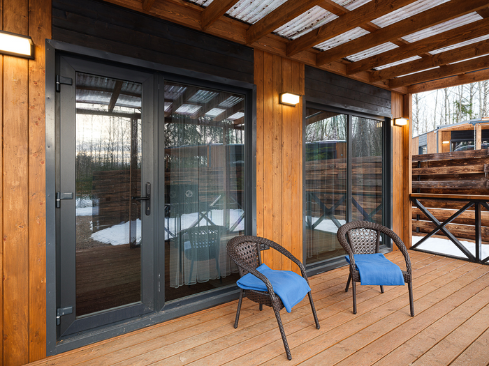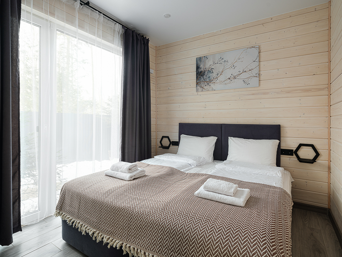 Дома площадью 70 кв.м рассчитаны на комфортное размещение компании до 6 человек. Полностью оборудованная кухня, 2 спальни и гостиная, уютная терраса и мангальная зона позволят насладиться загородным отдыхом в полной мере. Также на территории есть баня и горячие чаны.